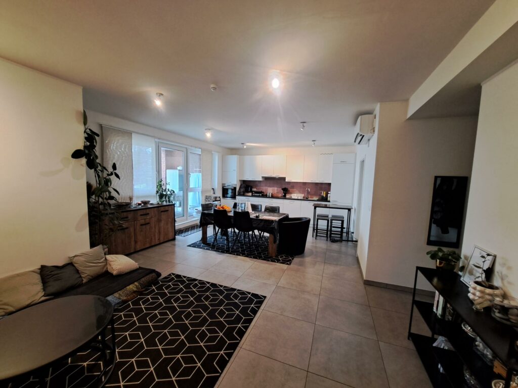 Composition : Hall d’entrée, lumineux séjour avec cuisine équipée ouverte, hall de nuit, deux chambres, salle de douche, WC séparé ainsi qu’un local technique/buanderie.